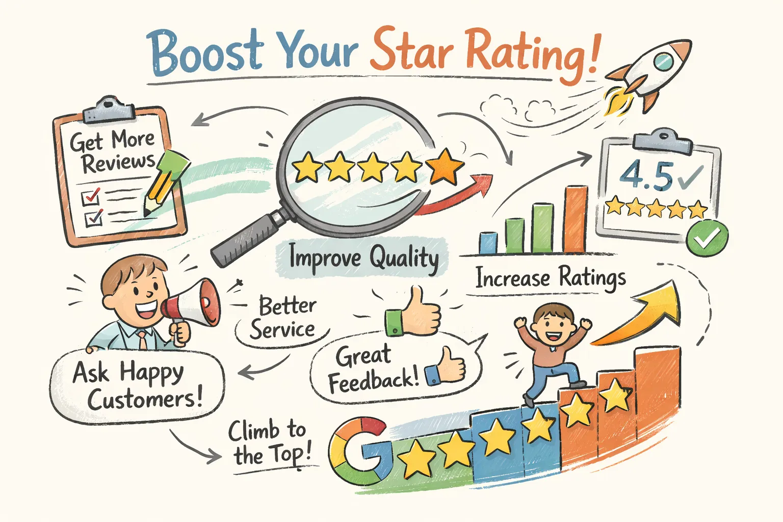 Most review improvement efforts fail because nobody calculated how many 5-star reviews are actually needed to move the score. A business at 4.3 stars with 200 reviews needs exactly 80 to reach 4.5 — that number changes everything about how you build a campaign. This guide covers the formula, the audit, the request workflow, how to handle negative reviews, and how to grow your rating without triggering platform penalties.